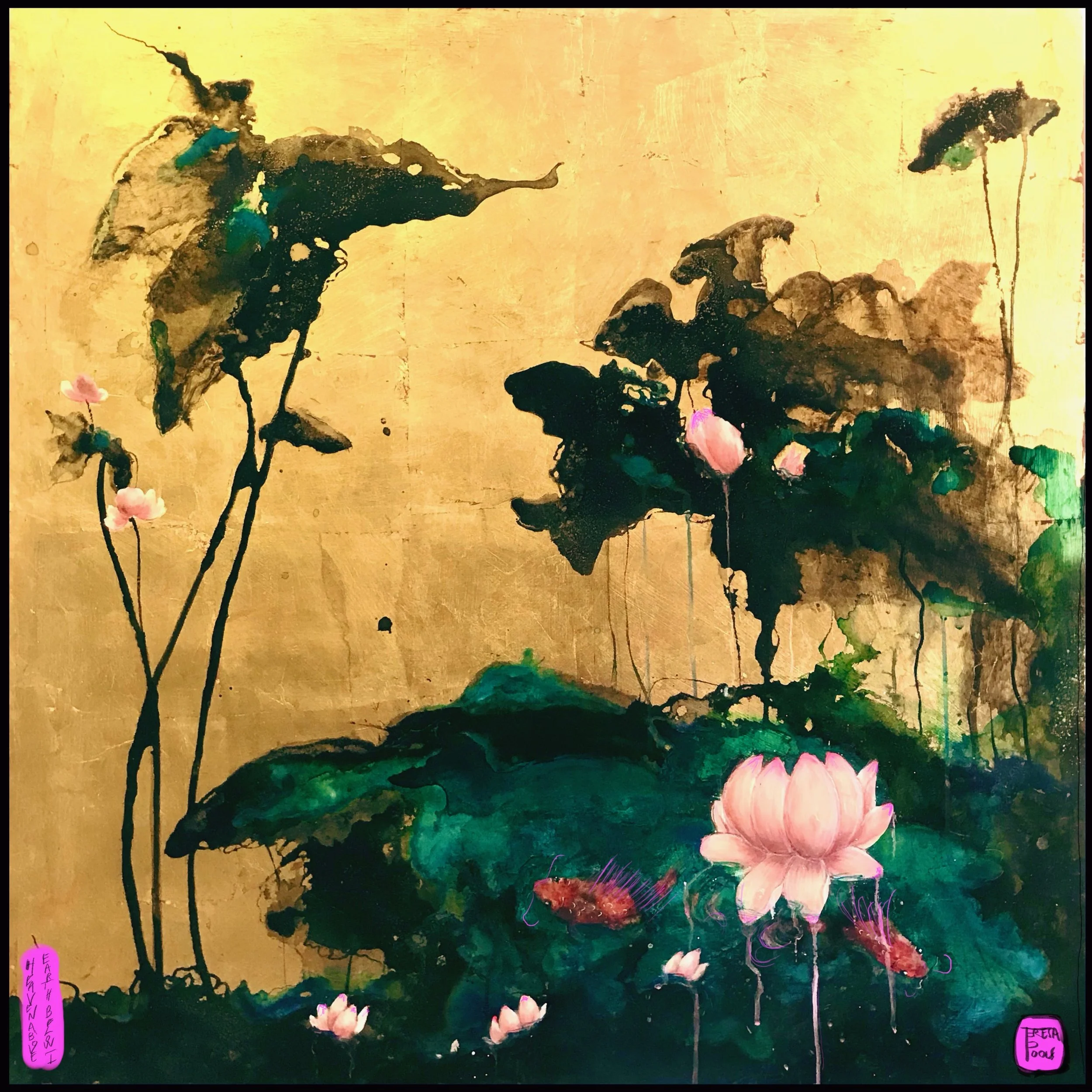 The works shimmer with vivid yet dreamlike imagery: flowing water, ethereal landscapes, and elements of nature rendered on glowing metal leaf and silk. Using inks, gesso, and patination, Poole creates a medley of colour and light—an exploration of memory, movement, and the quiet poetry within chaos.